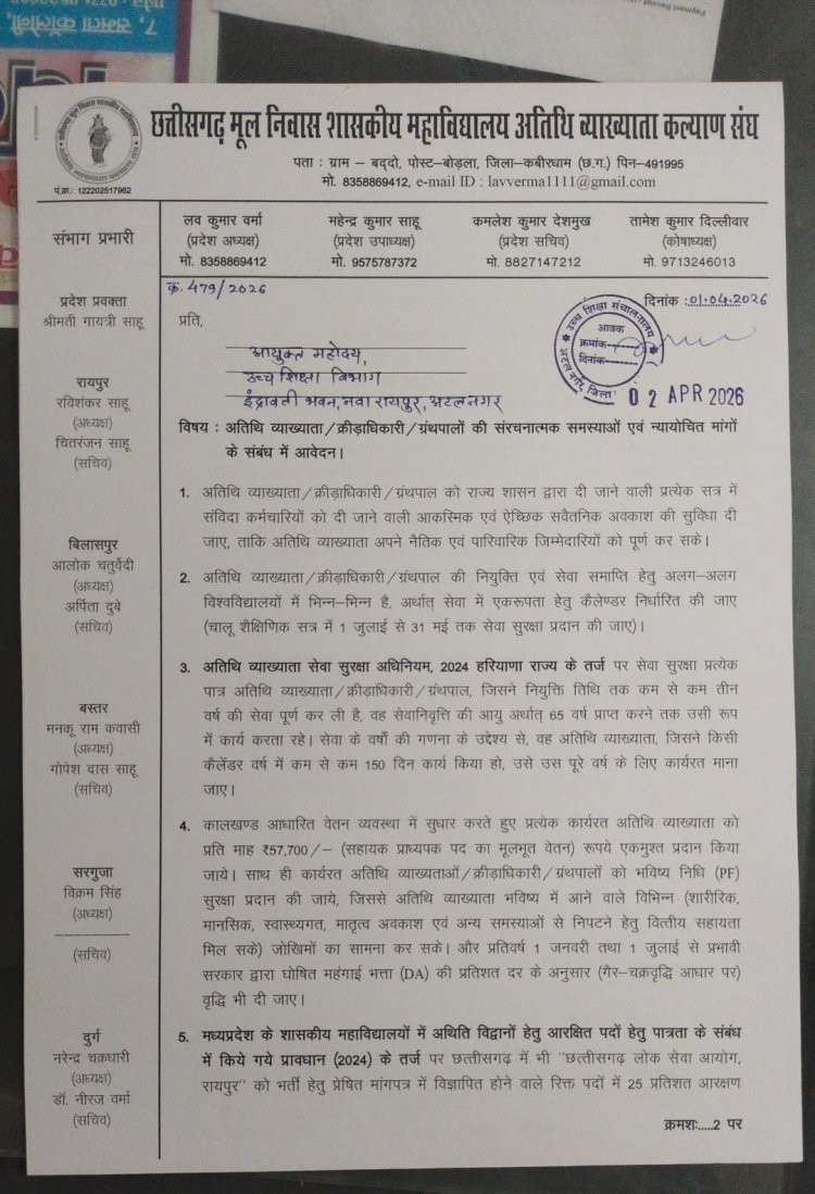 दिनांक 03/04/2026 अतिथि व्याख्याता / क्रीड़ाधिकारी / ग्रंथपालों की समस्याओं एवं सेवा शर्तों में सुधार न्यायोचित मांगों के संबंध में माननीय मुख्यमंत्री,उच्च शिक्षा मंत्री मुलाकात किया गया। विभिन्न मांग रखा गया जिसमें माननीय टंक राम वर्मा उच्च शिक्षा मंत्री जी अतिथि व्याख्याता की सेवा शर्तों सुधार के लिए समिति गठित करने का निर्देश उच्च शिक्षा विभाग दिया गया है।