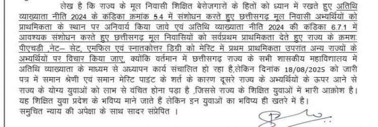 राज्य के मूल निवासी शिक्षित बेरोजगारों के हितों को ध्यान में रखते हुए अतिथि व्याख्याता नीति 2024 के कंडिका क्रमांक 5.4 में संशोधन करते हुए छत्तीसगढ़ मूल निवासी अभ्यर्थियों को प्राथमिकता के स्थान पर अनिवार्य किया जावे