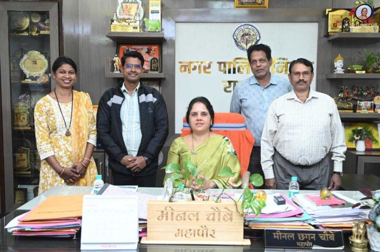 वामन राव लाखे वार्ड क्रमांक 66 में जल भराव से मुक्ति हेतु दंतेश्वरी चौक से नवनिर्माण नाले की स्वीकृति मिलने पर महापौर मीनल चौबे से कॉलोनी वासियों का सौजन्य भेंट